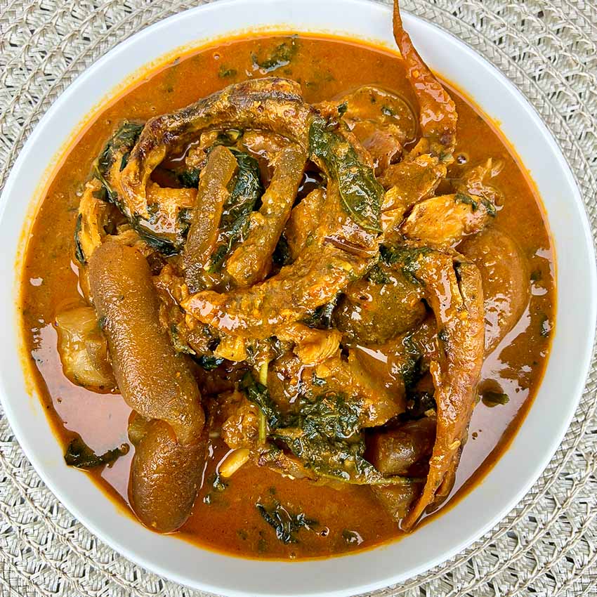 + Free ShippingThis soup is made with properly washed bitter leaves, meats and stockfish all simmered in a thick, seasoned broth. The slight bitterness blends perfectly with the rich flavours. It’s one of those soups that stick to the soul.