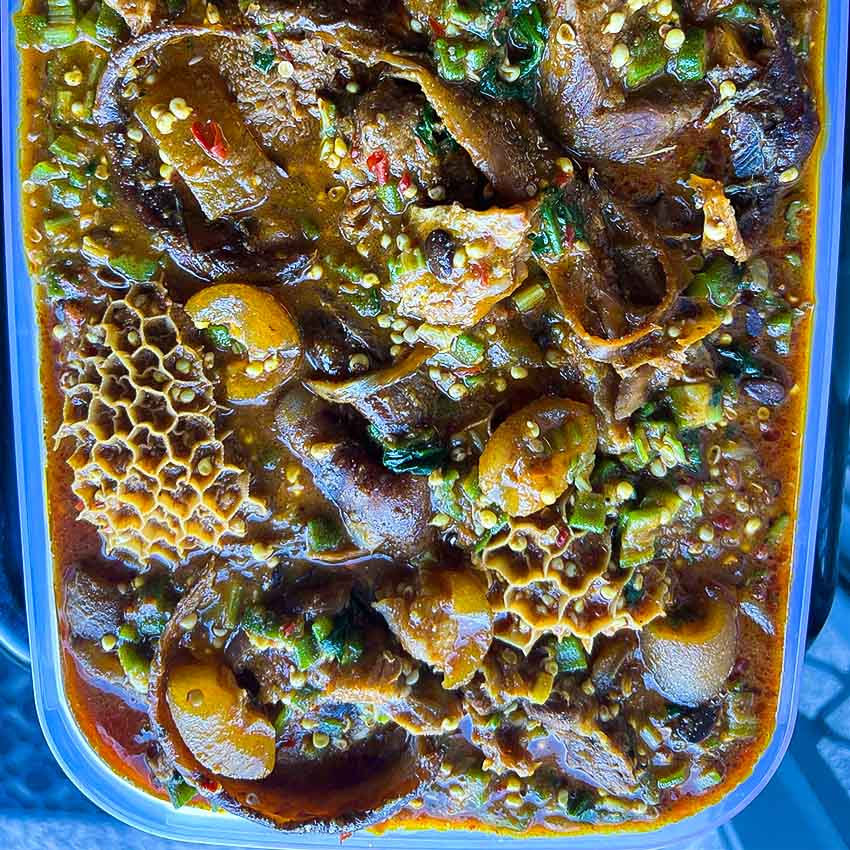 If you like okro, this version takes it up a notch. We make it with a mix of assorted meats, fish and prawns for a fuller, heartier soup. It draws beautifully and is packed with flavour in every bite.